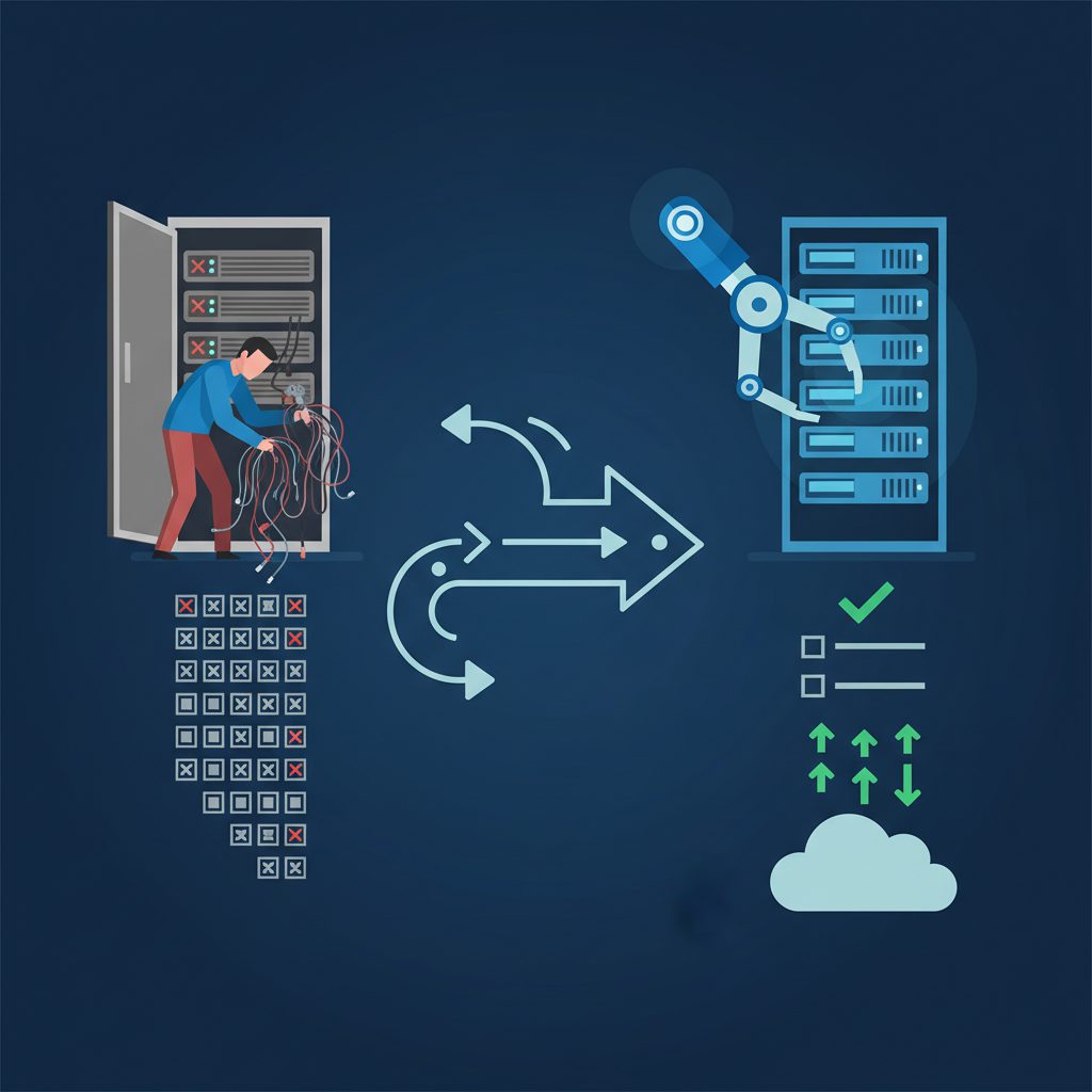 Repetitive manual tasks piling up on an engineer's desk vs automated pipeline running smoothly, cont